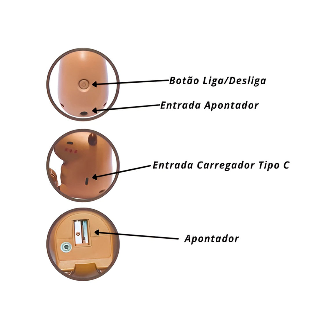 Apontador Integrado: Na base ou em outro ponto estratégico do design da capivara, um apontador funcional está sempre à mão para manter seus lápis prontos para uso.